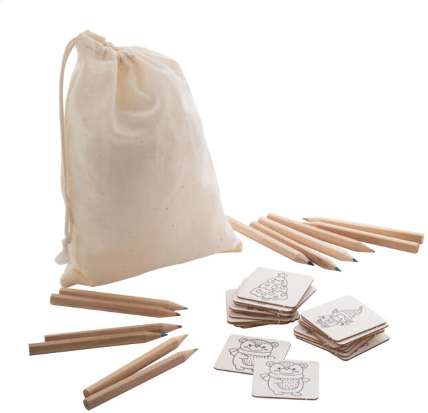 Karácsonyi színező memóriajáték pamut zsinóros tasakban. Karácsonyi motívumokkal ellátott karton memóriajátékot (24 lapka) és 12 db papírdobozban lévő fa színesceruzát tartalmaz.