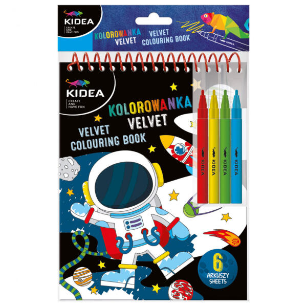 Bársony színező, 4 db filctollal, galaxy, Kidea. A füzet 6 színezhető, bársonyos lapot és 4 db filctollat tartalmaz.