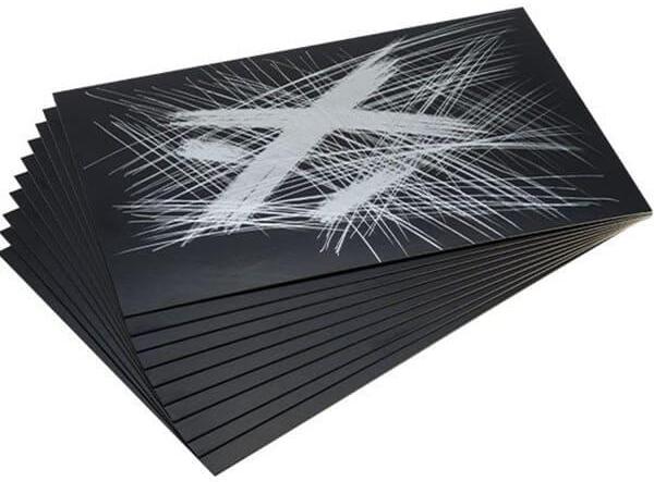 Fekete festékkel felülfestett, ezüst színű fóliával bevont kartonlapok egyedi karcképek készítéséhez . A karclap ból a saját fantáziája szerint készíthet karcképet.