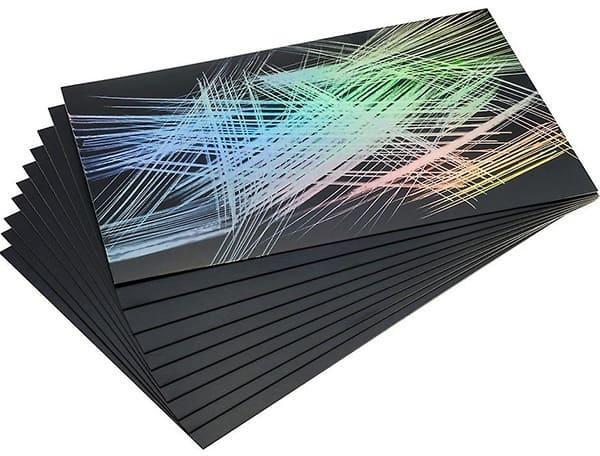 Fekete festékkel felülfestett, vörösréz színű fóliával bevont kartonlapok egyedi karcképek készítéséhez . A karclap ból a saját fantáziája szerint készíthet karcképet.