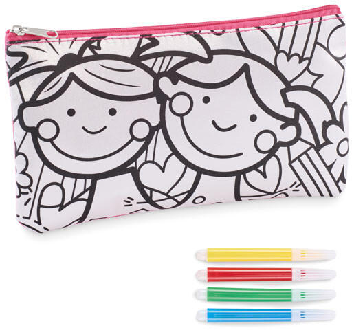Kiszínezhető tolltartó 600D poliészterből, 4 filctollal.