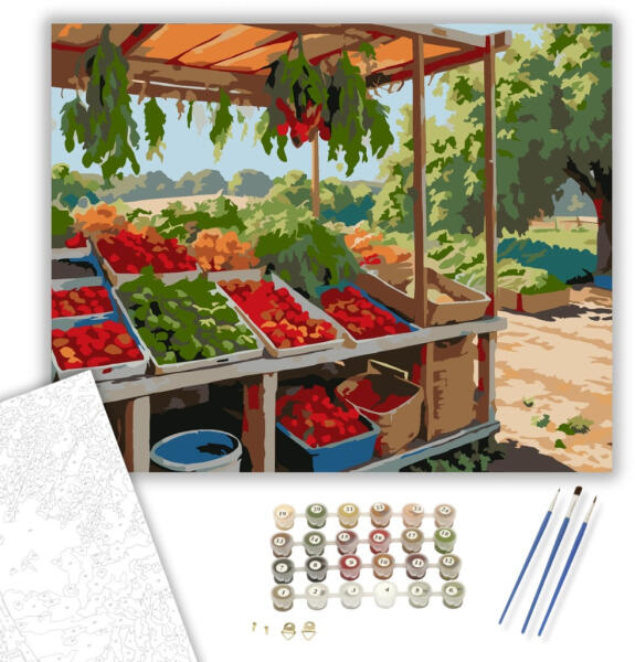 | Termékcímke | friss termények, gyümölcsök, nyári táj, piac, stand, zöldségek |